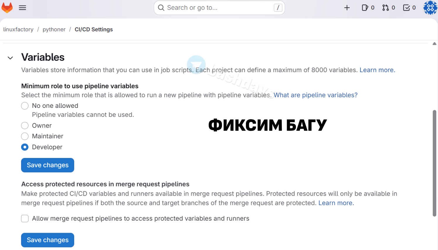 Идем: Settings → CI/CD → Variables и кликаем в радио-батон — Developer.