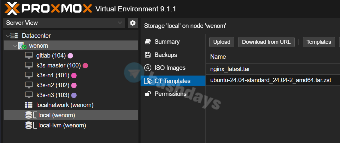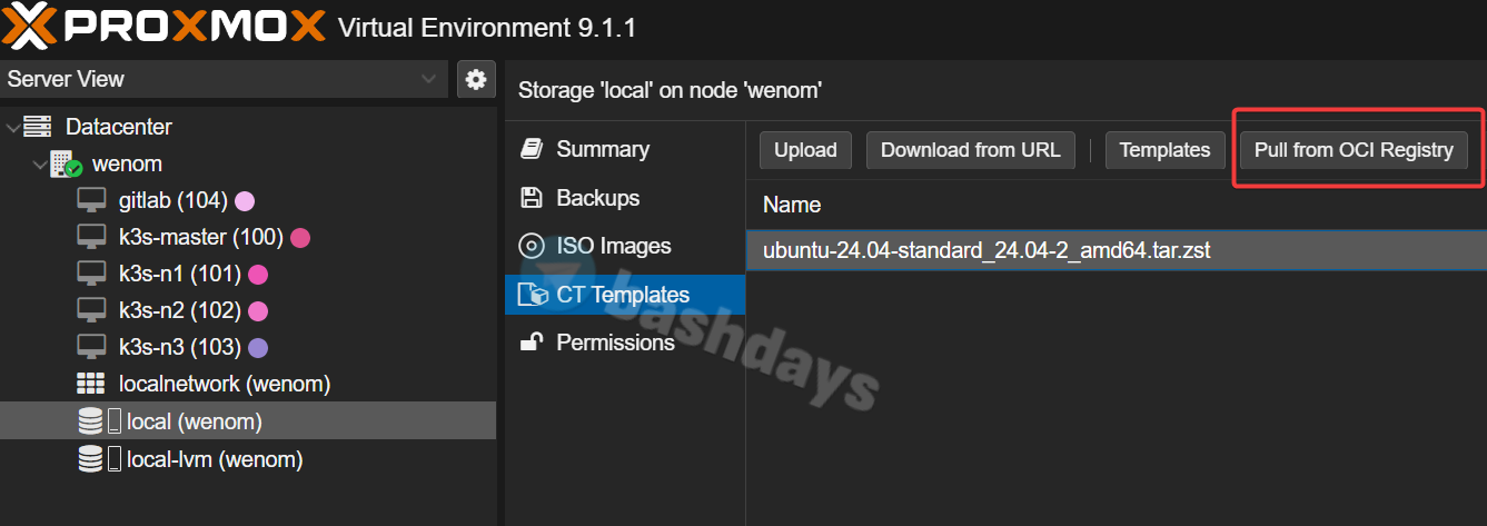 Заходим в Proxmox и идем в раздел с шаблонами, там будет кнопка Pull from OCI Registry.