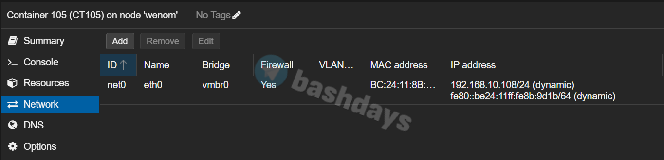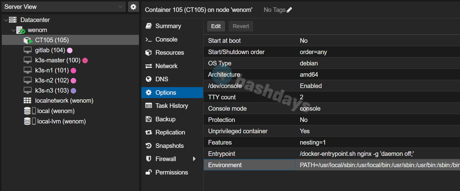 У каждого такого контейнера есть переменные, которыми можно управлять. В Proxmox переходим в контейнер, открываем вкладку Options и видим Environment