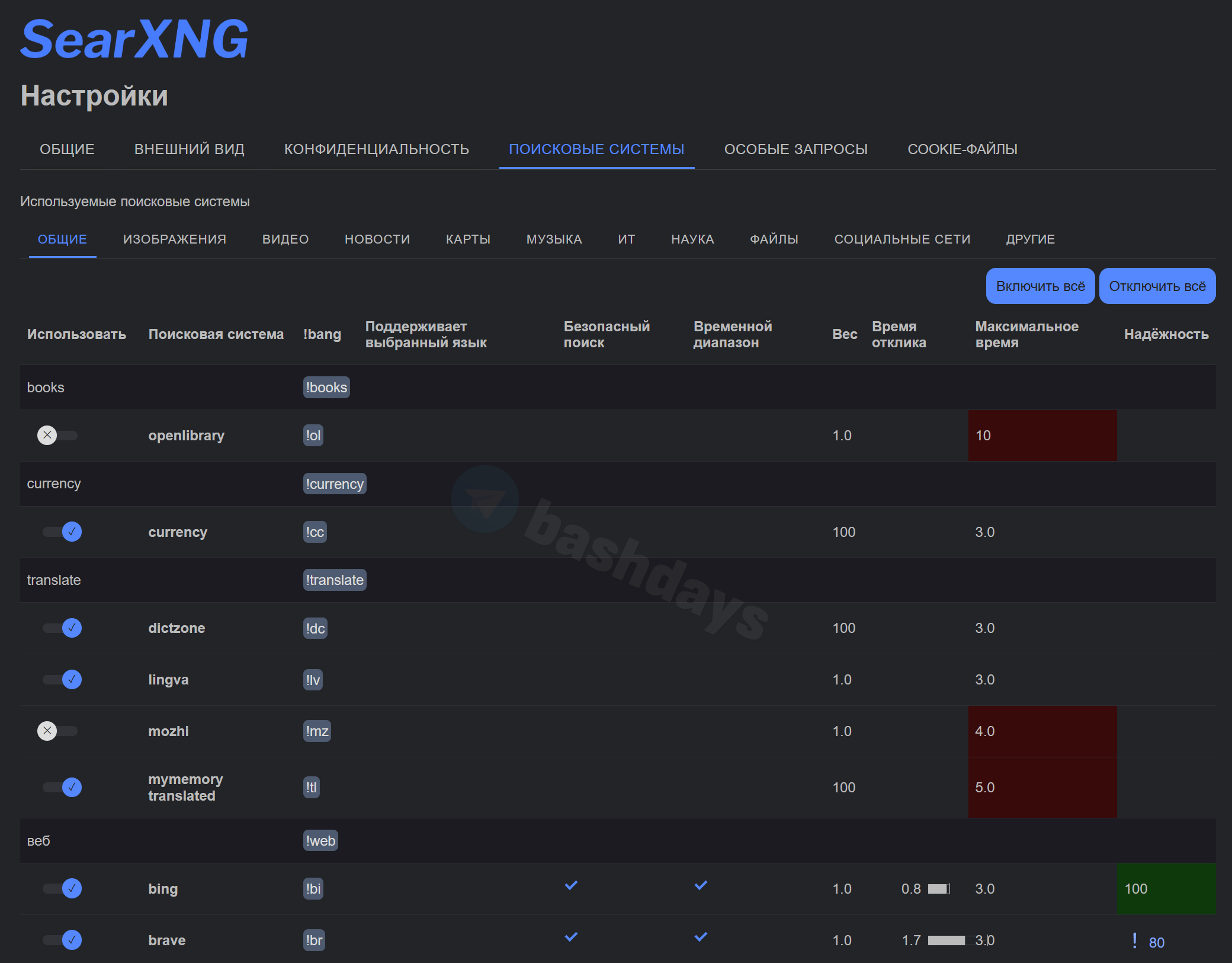 Обращаем внимание на SEARXNG_SECRET_KEY и secret_key они должны быть одинаковыми. Остальное интуитивно понятно. Да, еще если не нужна прокся, можешь закомментировать блок proxies, но рекомендую оставить, воткнуть луковицу либо приобрести быстрые socks5, либо поднять свои.