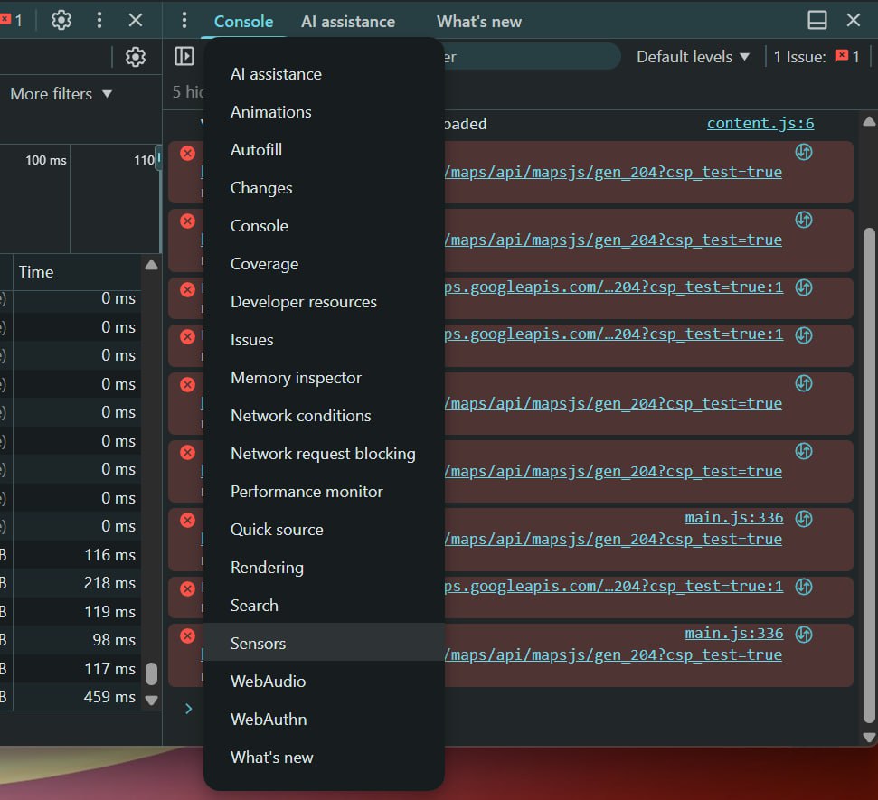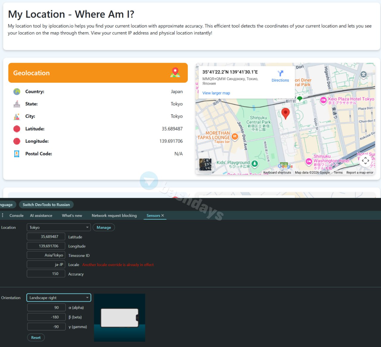 Суть вкладки — можно задать любую геолокацию. По итогу сайты, которые это отслеживают мягко говорю прихуеют. В Sensors можно поменять не только геолокацию (можно свою в пресетах накрутить), но и еще всякие штуки включить — ориентация, тачи а не клики, логическое число CPU.