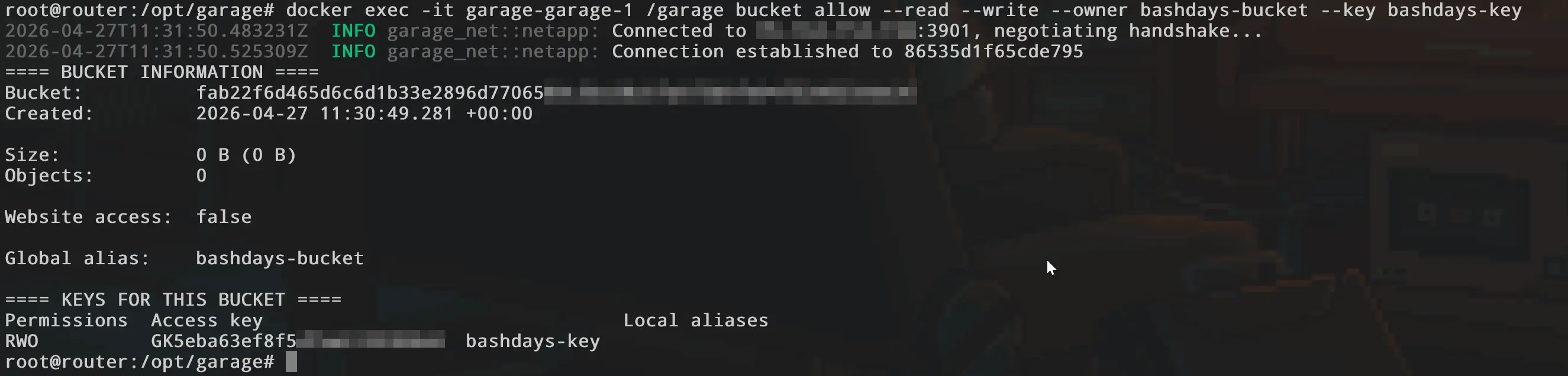 docker exec -it garage-garage-1 /garage bucket allow --read --write --owner bashdays-bucket --key bashdays-key