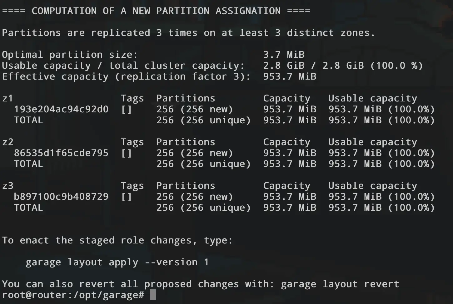 docker exec -it garage-garage-1 /garage layout assign b897100c9b408729 -z z3 -c 1G