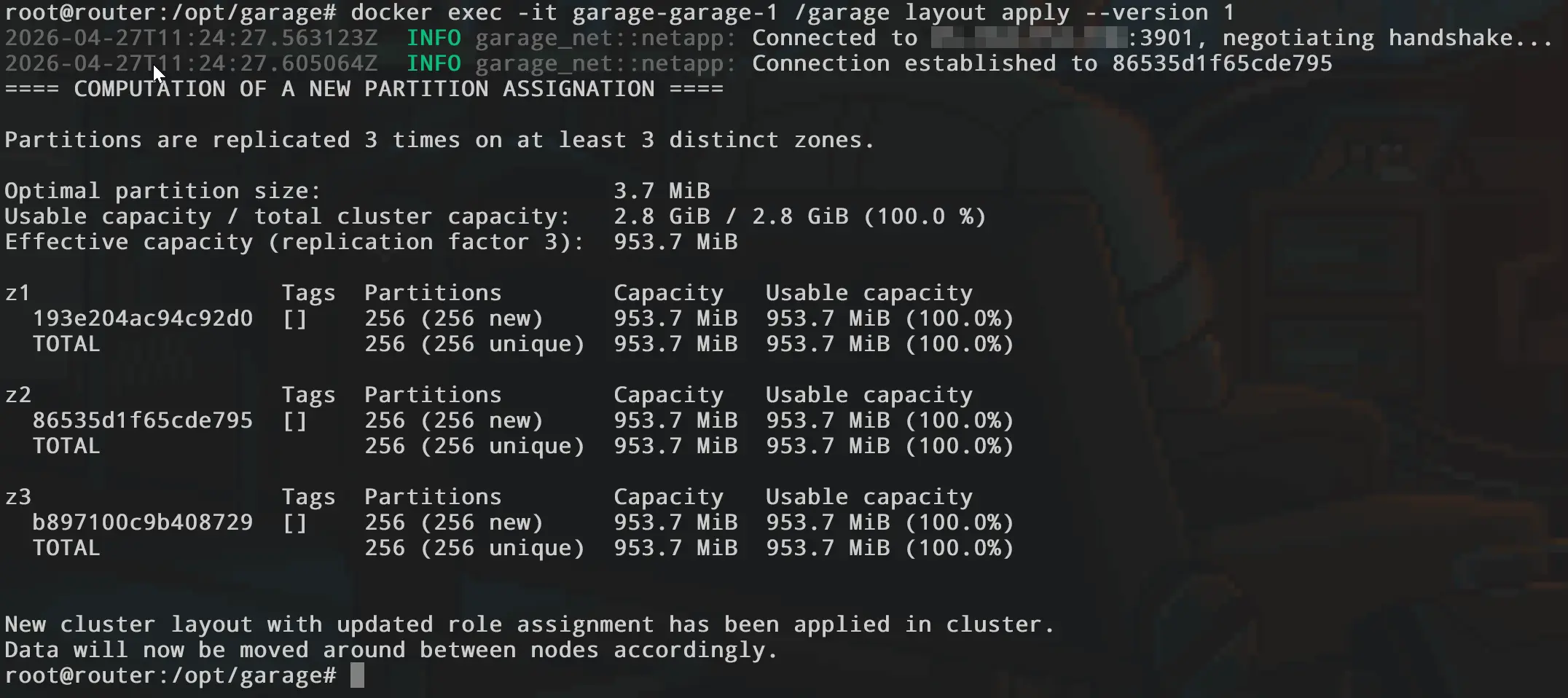 docker exec -it garage-garage-1 /garage layout apply --version 1